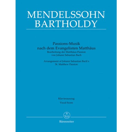 The new Bärenreiter edition returns to Mendelssohn’s unique vision of Bach’s masterpiece. By bringing together what Mendelssohn had sketched and including supplements to certain parts by the editor, the work is now presented in its reduced form, with the revised part for the Evangelist (in the secco recitatives with orchestral accompaniment), with clarinets replacing the oboe d’amore, and with a suggestion for the missing continuo part (which had been begun for the Thomaskirche organ but remained unfinished or was lost). The new edition shows not only Mendelssohn’s imaginative reinterpretation of the original, but also the versatility of Bach’s music in his hands. In an age in which Bach is played almost exclusively by Baroque ensembles, it allows them the opportunity to perform one of Bach’s greatest works from a 19th century perspective.