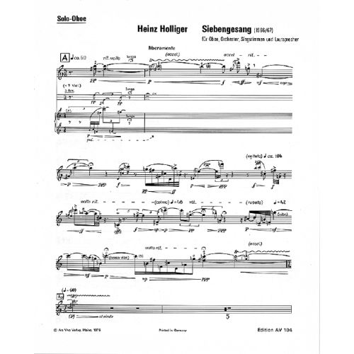 Das Werk „Siebengesang“ ist 7teilig: in den drei ersten Teilen treten sich das Soloinstrument und verschiedene selbständige, nach Register und Klangfarben geordnete Orchestergruppen gegenüber. Im 4. Teil durchdringen sich Solooboe und ein Ensemble von 4 linearen Instrumenten. Der 5. Teil ist ein großangelegtes Orchester-Crescendo. Über 23 von Gong-Signalen markierten 5-Sekunden-Abschnitten werden nach und nach die verschiedenen Orchestergruppen (jede mit individuellem Tempo) übereinander geschichtet. Der 6. Teil konfrontiert mit Hilfe eines im Innern des Instrumentes angebrachten Mikrophons verstärkten und verzerrten Oboenklang mit dem ganzen Orchester, wobei die neuen, ungewohnten Klänge der Oboe das Klangspektrum des Orchesters in großem Maße beeinflussen. Auf knappstem Raum werden hier in hektischem Wechsel die äußersten strukturellen Gegensätze zusammengedrängt. Im sehr ruhigen Schlussteil vervielfacht sich die Oboenpartie in 7 Singstimmen, denen als phonetisches Material die Schlußverse von Georg Trakls Gedicht „Siebengesang des Todes“ zugrunde liegen [….].