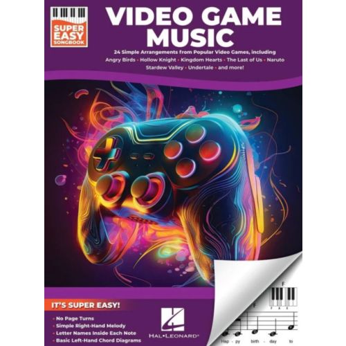 Embark on a musical quest with Video Game Music - Super Easy Songbook! Featuring 24 iconic themes from beloved games like Angry Birds, Hollow Knight, Kingdom Hearts, The Last of Us, Stardew Valley, and more, this collection is designed for beginning pianists of all ages. With simple right-hand melodies, letter names inside the notes, and basic left-hand chord diagrams, playing your favorite video game tunes has never been easier!